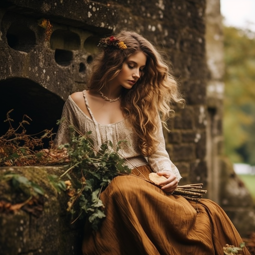 You arrive at an island where there is a castle; within is Olwen, Lady of Flowers, sitting in her garden. She is young and beautiful, and understands about the nature and restrictions and the need for freedom. Ask for her advice. She rises. Follow her. In every footprint she leaves a three-petalled flower. See where she leads you. Remember your journey and return.