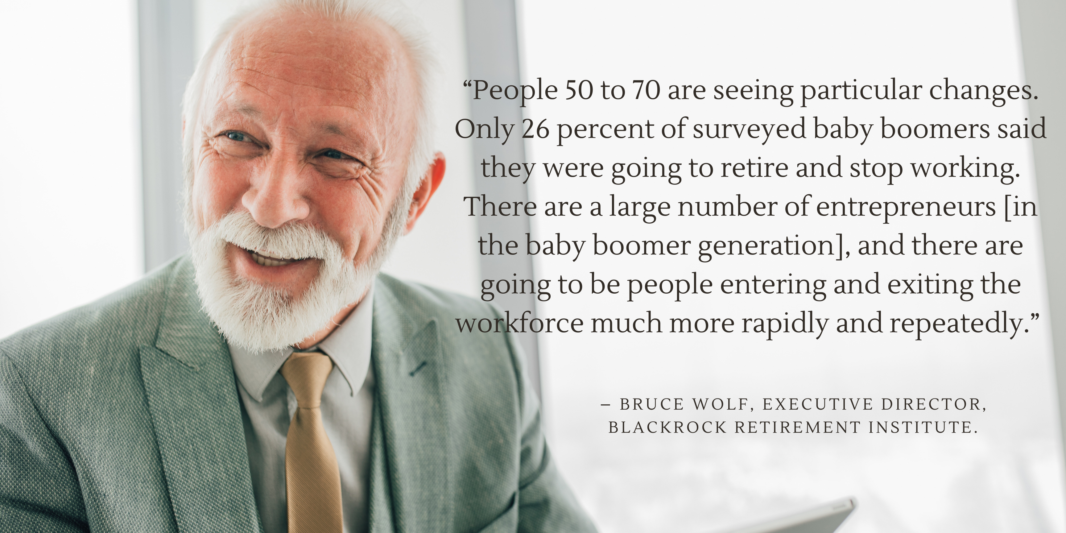 “People 50 to 70 are seeing particular changes. Only 26 percent of surveyed baby boomers said they were going to retire and stop working. There are a large number of entrepreneurs [in the baby boomer generation], and there are going to be people entering and exiting the workforce much more rapidly and repeatedly.” – Bruce Wolf, Executive Director, BlackRock Retirement Institute.