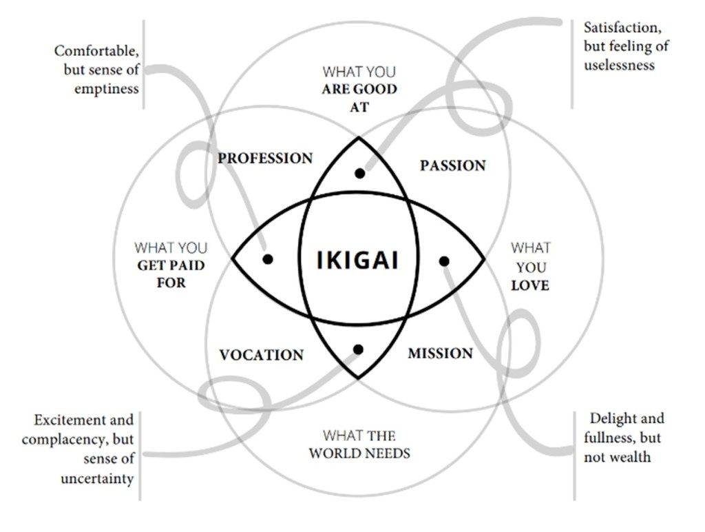 Ikigai (Reason for being) is the nexus of: what you are good at (talents) + what you love (passion) + what the world needs (planet) + what you (or others) get paid for (profit).