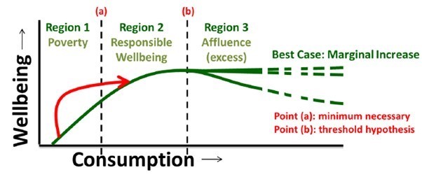 When you have insufficient wealth, twice as much wealth can make you twice as happy. As you approach the comfort zone (a), increases in well-being start to be smaller in relation to increases in your consumption. Eventually, well-being gains level out. Excess consumption (b) can often result in a reduction in your well-being.