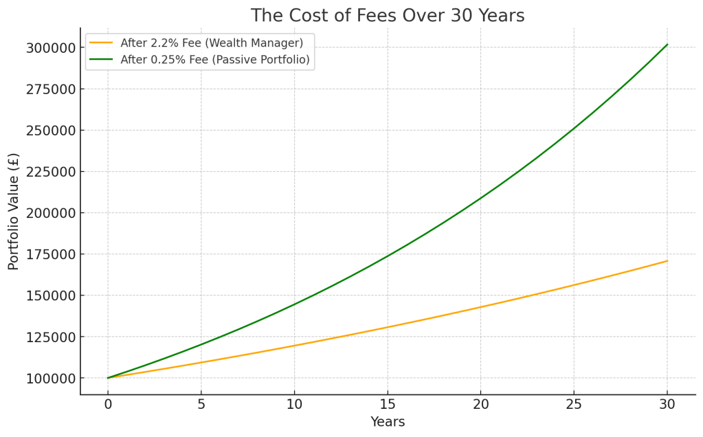 Here is a graphical representation of the impact of fees over 30 years, comparing a Wealth Manager Portfolio (2.2% fees) and a Passive Portfolio (0.25% fees).