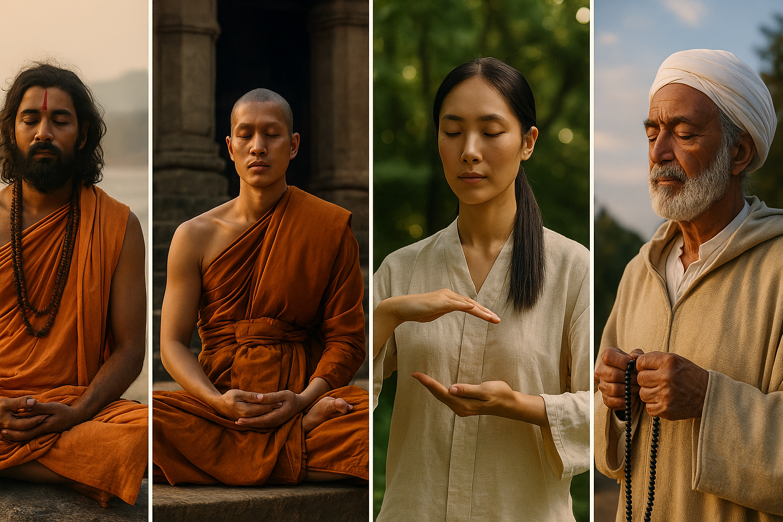 Hinduism offers multiple yogas — bhakti (devotion), jnana (wisdom), karma (selfless action), and raja (meditative discipline) — but all share one purpose: to transcend the illusion of the isolated ego.